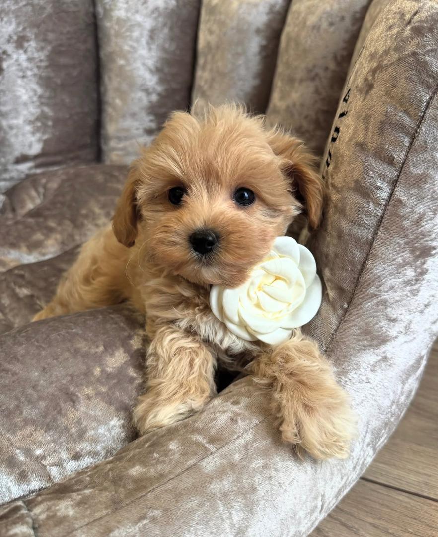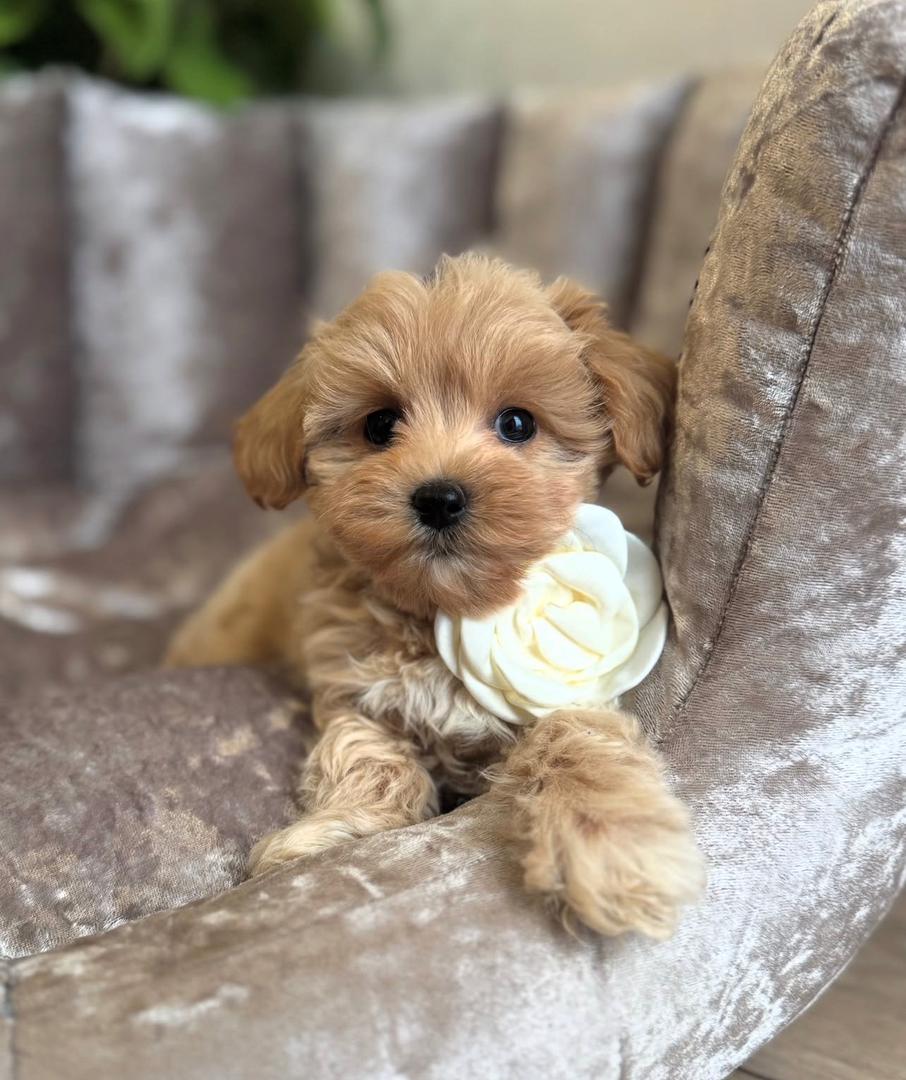 Meet Aurora, an exceptionally adorable maltipoo puppy for sale with a soft, fluffy light brown maltipoo coat and an incredibly gentle personality. At 9 months old, Aurora has grown into the perfect balance of sweet, playful, cuddly, and intelligent. As a true hypoallergenic maltipoo, she is ideal for families looking for a low-shed, allergy-friendly companion who is easy to maintain and wonderful with children and adults.