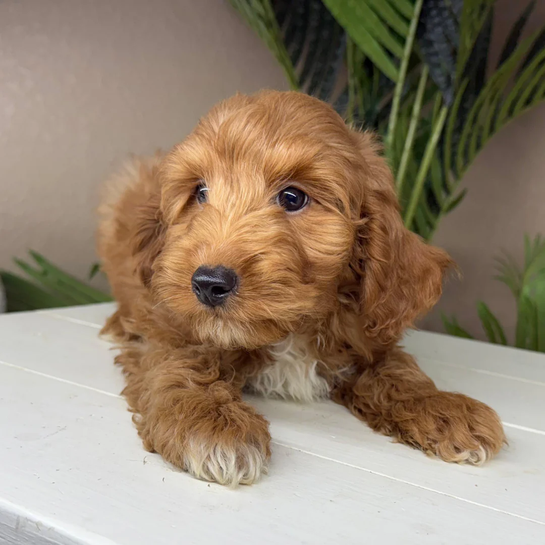 He is well-socialized, crate-trained, and ready for home life, making him perfect for families seeking a medium size Goldendoodle puppy or an intelligent, family-friendly companion. Whether you’re searching for designer Goldendoodle puppies, goldendoodle puppies near me, or an affectionate apricot Goldendoodle ready now, Edgar is an exceptional choice.